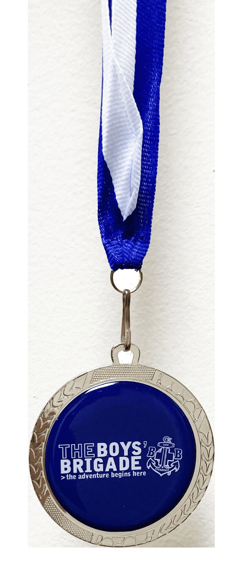 Large 60mm Silver Medal featuring BB logo on a Blue/White Ribbon